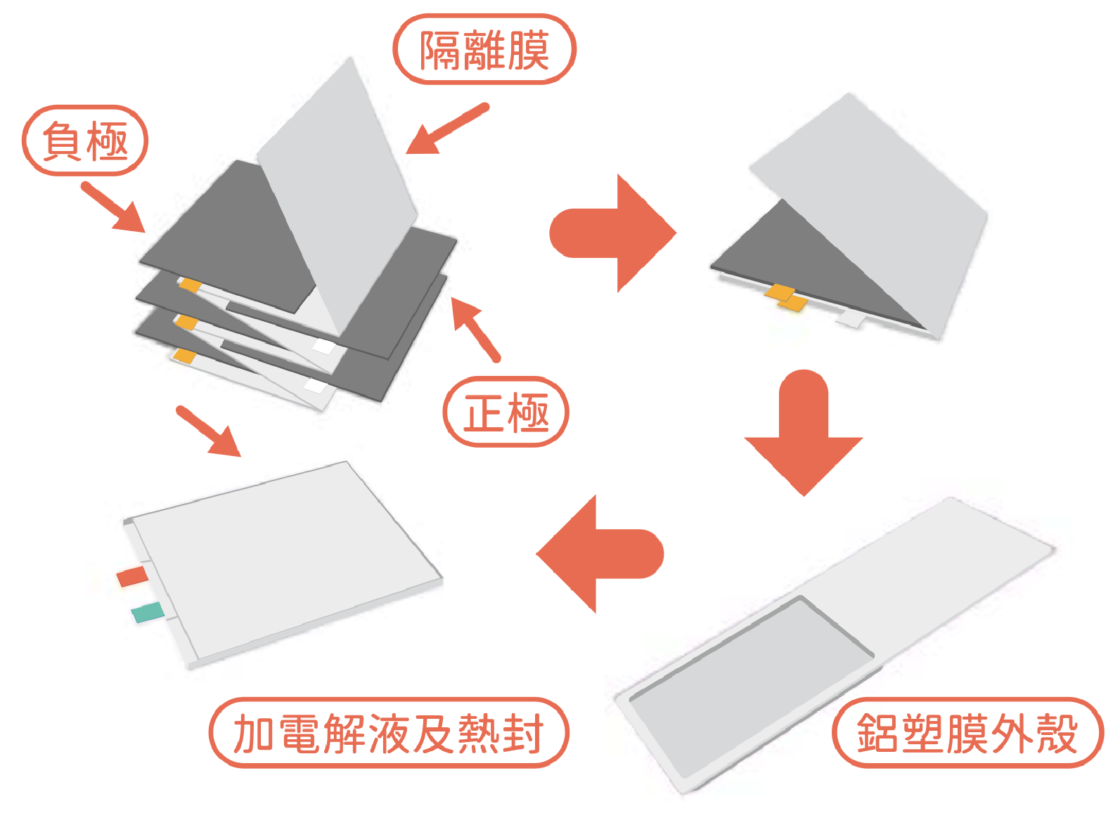 若仔細分析鋰電池的熱失控,會發現它是一連串的連鎖反應。首先是電池短路或是環境過熱,使得電池溫度升高到約 100℃。此時負極表面的保護層會分解和放熱,將電池溫度上升至約 150℃,造成電解液開始出現放熱的分解反應,使電池溫度持續升高到 200℃。而後電解液和正極反應並放熱,進一步將溫度拉高 300℃。最後是整體電池內部包含負極、隔離膜、正極在內,會和電解液形成激烈的燃燒反應,最終形成熱失控。從理論來看,只要能中斷熱失控連鎖反應中間的任一階段,就能使反應難以持續進行,溫度也可以逐漸下降,熱失控就會受到控制。