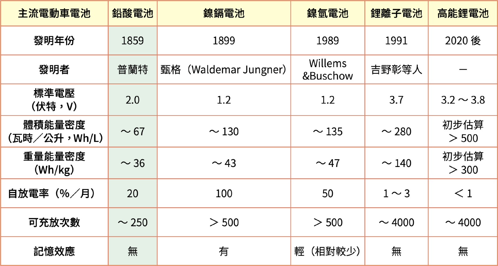 1859 年,法國物理學家普蘭特(Gaston Planté)發明了第一個二次電池——鉛酸電池,它目前在二次電池的市場占有率最高。目前所有電動車電池的技術研發都依循增加能量密度及壽命的路線發展。若以鉛酸電池現有能量密度約 36 瓦時/公斤(Wh/kg)做比較,使用後來發明的鹼性電解液的鎳鎘電池及鎳氫電池,能量密度則可增加 40%,約為 45 Wh/kg;而使用有機溶劑電解液的鋰離子電池,能量密度則能夠増加約三倍,約為 140 Wh/kg,循環壽命更是鉛酸電池的 16 倍,高達 4,000 次(表二)。