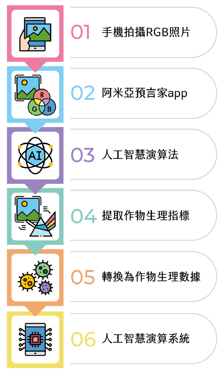 近四年的研究歷程中,研究團隊成功地利用傳統儀器找出關鍵的作物生理指標,然而這些儀器的昂貴價格和需求高度訓練的人力,成本居高不下、難以進入應用。為因應這一挑戰,研究團隊成功開發了一套能夠利用 RGB 註 影像辨識作物生理指標的技術,更引入 AI 建構預測系統,使用者只需透過拍照的方式,即可準確判斷作物的生理狀態並提供最佳的灌溉決策。