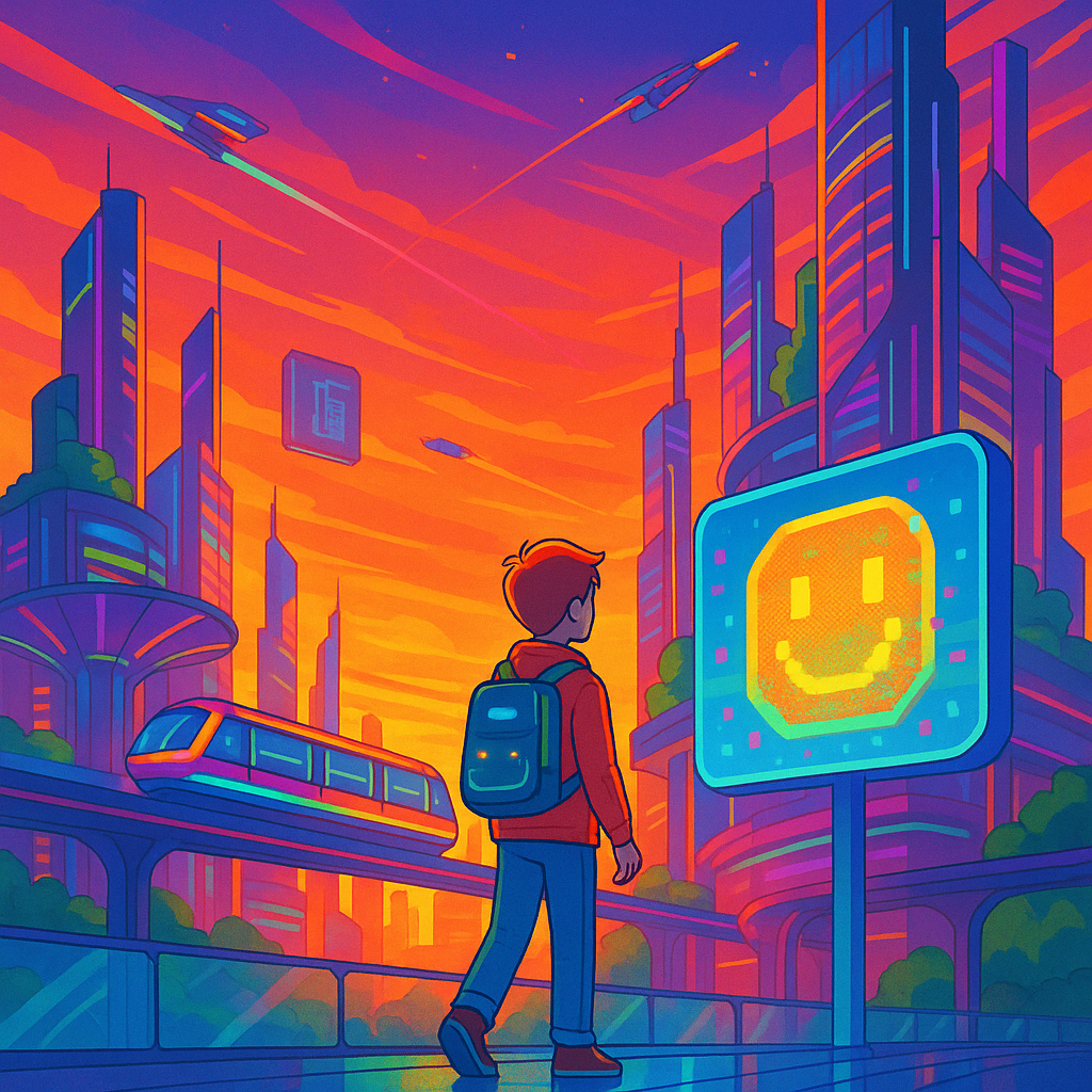 清晨的 2325 年城市,比陽光先醒來。氣候調節塔緩緩開啟晨光模式,雲層被分成均勻的薄片,讓光線以最柔和的角度降落。漂浮列車的軌道在高空蜿蜒,如同一條嵌著金線的絲帶,從城市中央的資料塔延伸至郊外的森林居所。艾嵐背著全息背包走在空中步道上,透明能源柱沿途閃爍著微光,像是替城市測量脈搏。這一天,他正式成為「記憶見習員」,而他的第一個任務,是尋找一段百年前的笑聲。