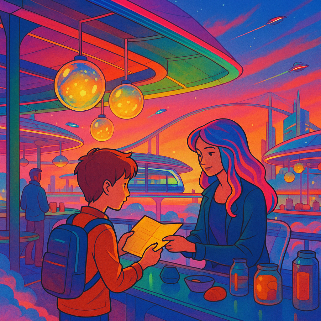 艾嵐走過一排懸浮攤位,有販售「雨天的味道」的小瓶子,打開時會聞到潮濕泥土與閃電前的涼意;有賣能讓人短暫聽見遠方歌聲的耳飾,聲音像從雲端飄下來。他忍不住停下來觀看一名攤販表演,將一段祖母的笑聲裝進光球,像捕捉螢火蟲一樣輕巧。穿過光影交錯的走廊,他看見了芮卡。她坐在一張半透明的椅子上,長髮像霓虹線條隨心情閃爍。芮卡從腰間抽出一只聲音瓶,瓶中光點緩慢漂浮,像在水下呼吸。
