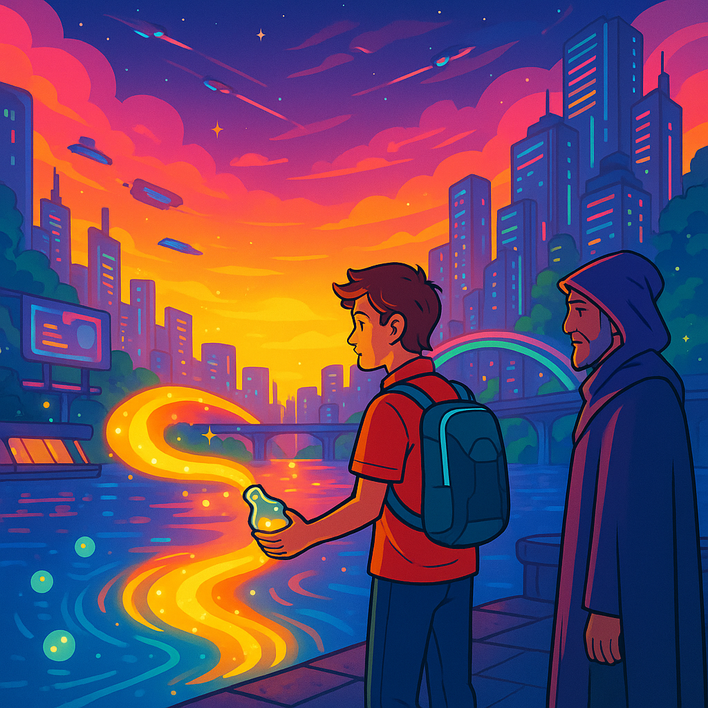 艾嵐閉上眼,晨光、漂浮市集的香氣、母親的故事交織成一幅畫。他想起母親笑著把海風攬進懷裡的模樣,那笑聲像竹林間的風,帶著鹹味與暖意。瓶蓋在掌心顫動,「喀」的一聲,笑聲溢出。河面瞬間泛起一圈圈光波,沿著河道傳遞,經過光橋,經過能源柱,穿過漂浮列車的軌道。