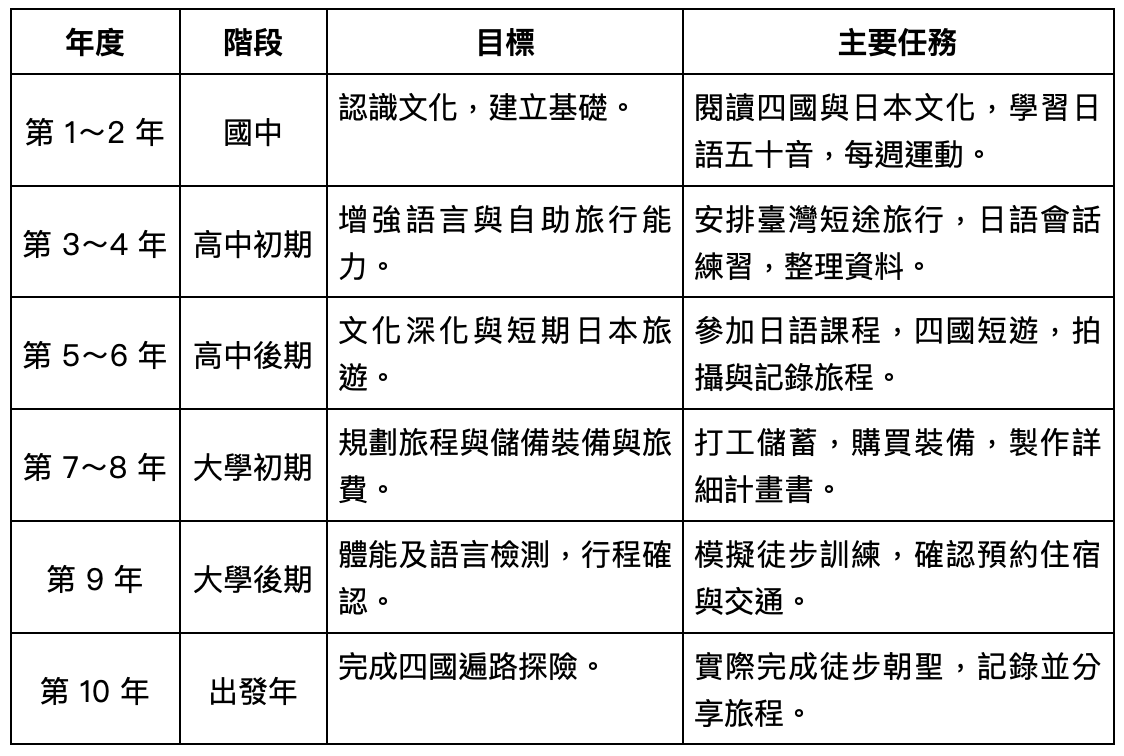 我最期待第 10 年,因為那是我真的要去四國時候。前面幾年我會準備語言、體力和裝備,但第 10 年才是真正出發。我很想親眼看到日本的風景、古老的寺廟,也想知道自己能不能靠自己的力量完成這一大段旅程,所以這我是最期待那一年。