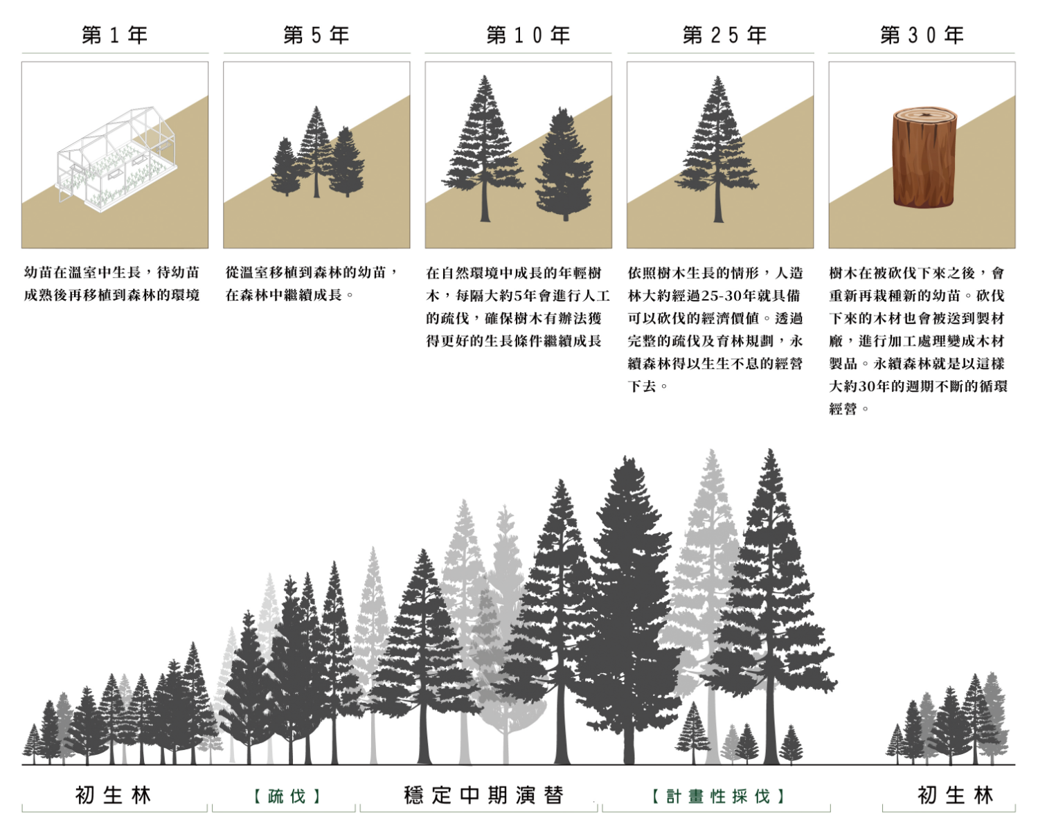 ✤ 經濟性人工林能收穫木材且具商業價值,而維持伐採、疏伐、造林則可維持森林健康和生產力。