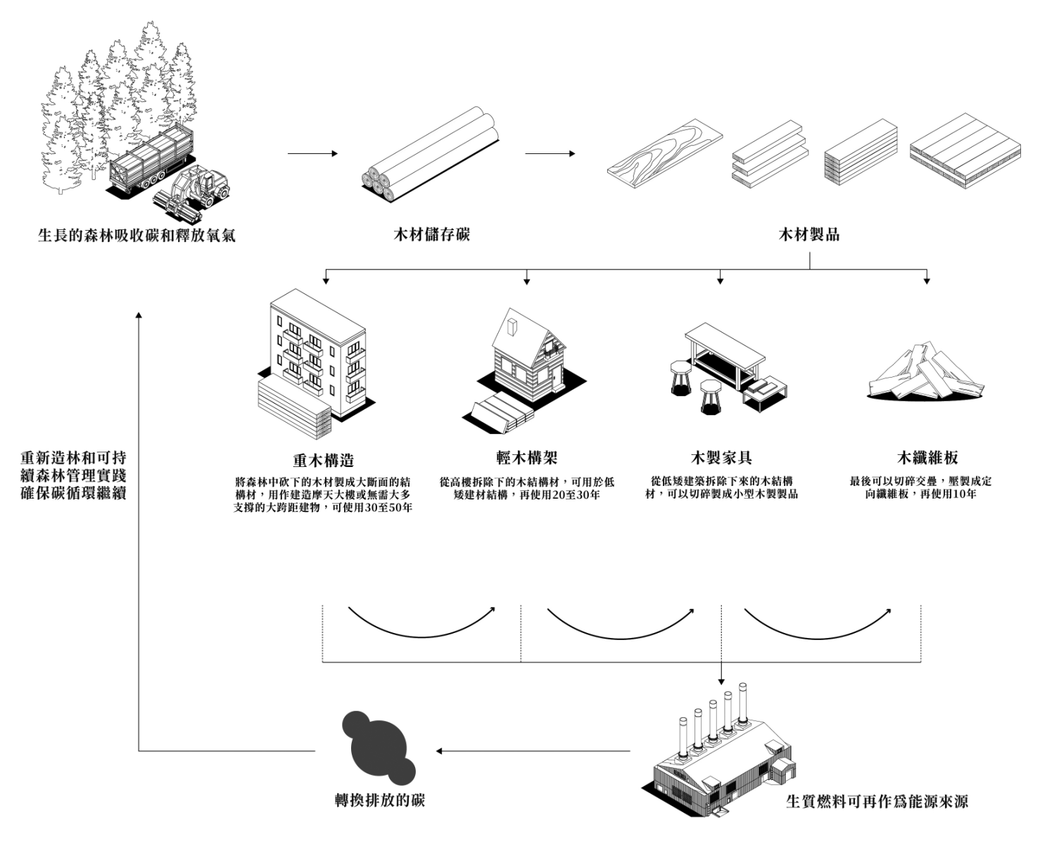 森林在自然界的碳循環中扮演著至關重要的角色,樹木通過行光合作用,吸收大氣中的二氧化碳並釋放氧氣。在此過程中,大氣中的碳被積累在樹木細胞中,並以木材的形式被固定下來。當我們選擇以木材作為建築材料使用時,這些碳就相當於被儲存在建築物中。因此,森林和木材的使用直接有助於緩解全球暖化(圖二)。