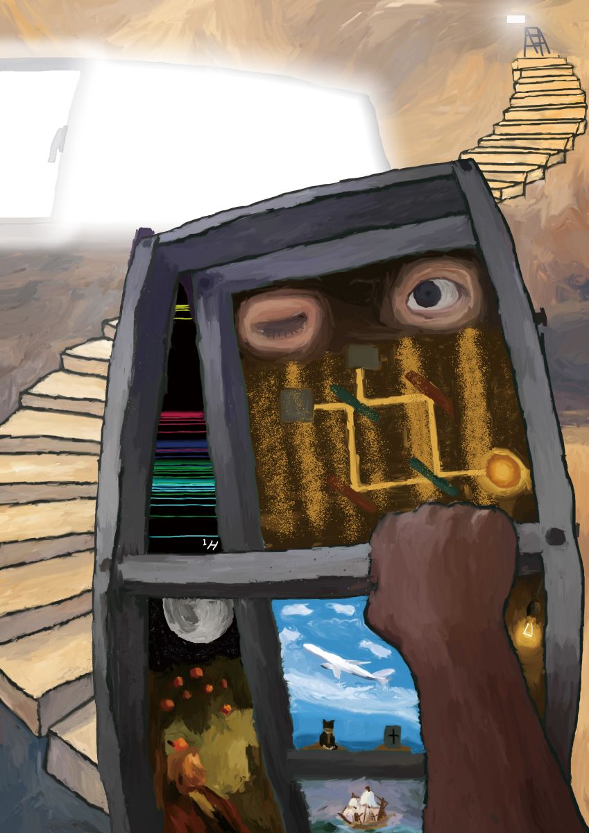 這幅畫給人極具象徵性、哲思感的印象,畫面中央是個如機械或電子元件構成的方框,內有一隻眼睛和電子電路般的線條,彷彿示意人類與科技、物質與意識間的交纏及互動。背景那條通往天際的階梯,象徵未知與探索;畫面下方的海洋、飛機和划船者,則展現了宏觀世界的活動,對比出量子層次和人類現實間的交錯。整體色調在溫暖與冷冽間流轉,暗示著理性與感性的糾纏;構圖中那隻伸出的手像在操作或揭開某個神祕面板,也可能代表人類試圖掌握自然法則、探索宇宙奧祕的意志。此作以多層象徵手法呈現「量子糾纏」的精神——萬物互相影響、彼此連繫,無論是科技、自然、意識或命運,皆在看似分離卻深層相連的世界中共振。