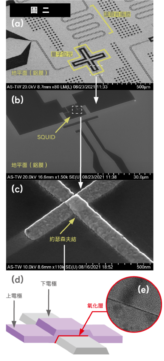 ▲圖二:(a)超導量子晶片製作在矽晶片上的全鋁製超導量子晶片,含有十字形量子位元。(b)十字形電容下端的 SQUID,SQUID 由兩顆並聯的約瑟夫森結組成。(c)、(d)約瑟夫森結的電子顯微鏡相片及示意圖。(e)氧化層的穿隧電子顯微鏡相片。圖片提供/本文作者