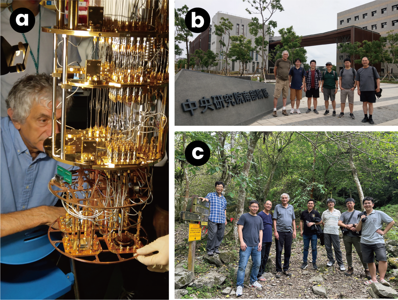 ▲圖四:教授馬丁尼斯與中研院團隊的互動。當時馬丁尼斯是中研院量子計畫的顧問,與團隊每周都會固定線上討論,他也在 2024 年親自拜訪臺灣。(a)他到中研院物理所的實驗室與團隊討論量子電腦低溫線路問題。(b)他到中研院南部院區參訪。(c)他與團隊一起到花蓮太魯閣旅遊。圖片提供/本文作者