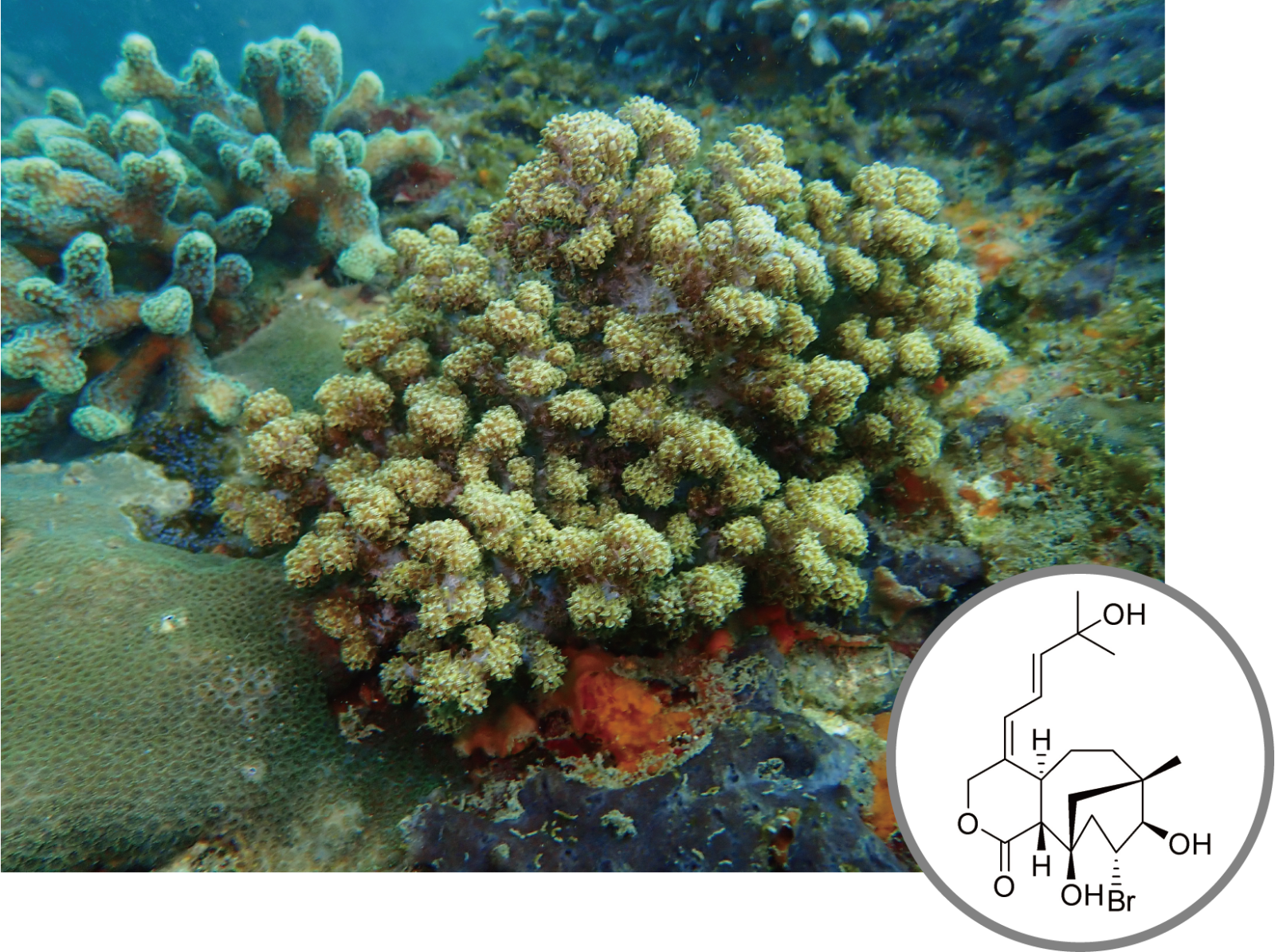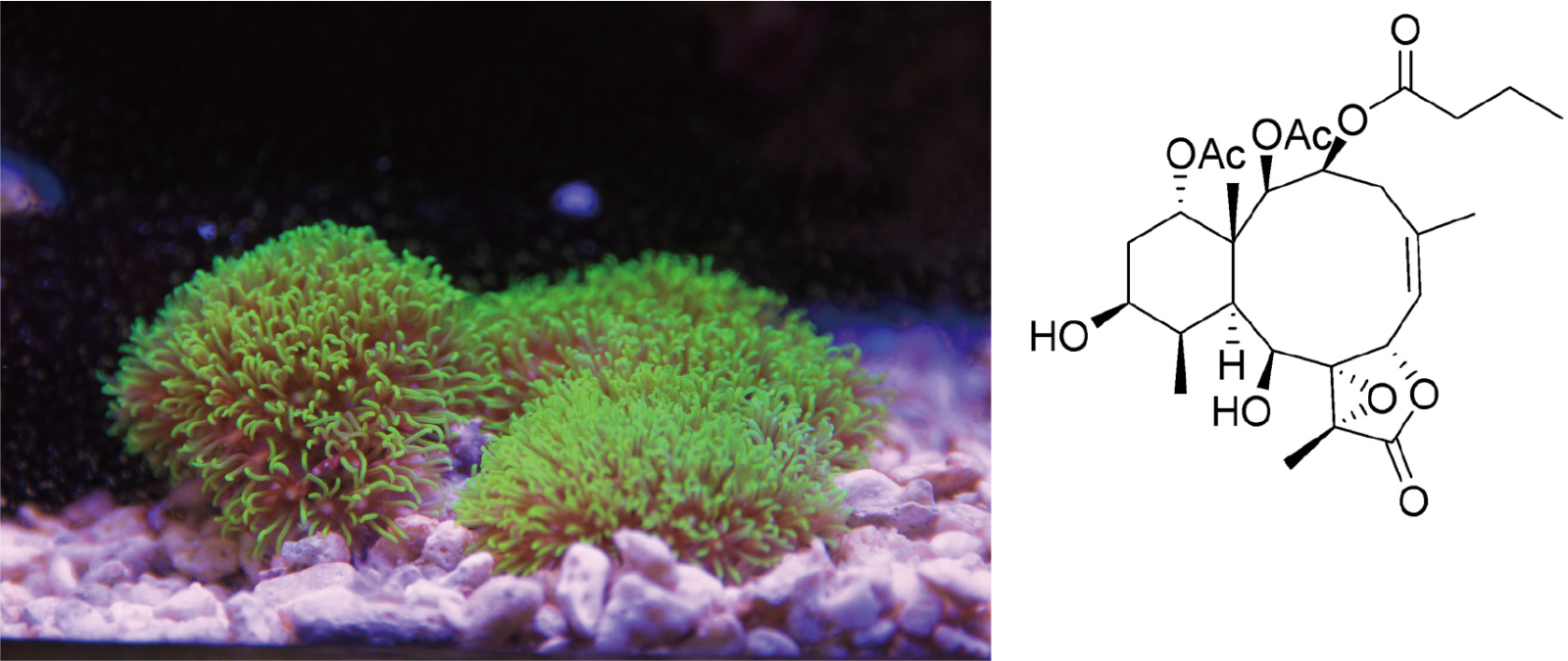 像軟珊瑚就富含雙萜類(diterpenoid)化合物,這是牠們用來抵禦病原體與掠食者的重要化學防禦物質。在過去的藥效評估試驗中,發現軟珊瑚的雙萜類物質具有抗發炎及抗癌效果。筆者於是研究蘭嶼採集的星形軟珊瑚活性成份,並從中找到了能抑制乳腺癌細胞(MCF-7)生長的海洋天然物,證實台灣原生的軟珊瑚產生的天然物,具有做為抗癌藥物的潛力。