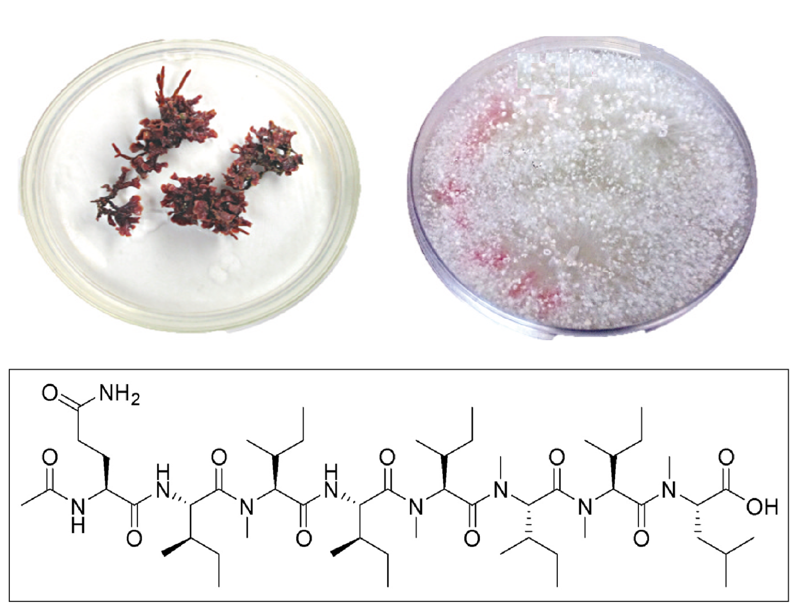 ▲與海藻共生的真菌:從台灣海域取得的寬珊藻(Mastophora rosea,左上)中,分離培養藻源真菌Acremonium sp. (右上)。再從培養的真菌菌株中,分離並純化出抗發炎活性成分acrepeptin C(下)。 影像來源/李宗徽