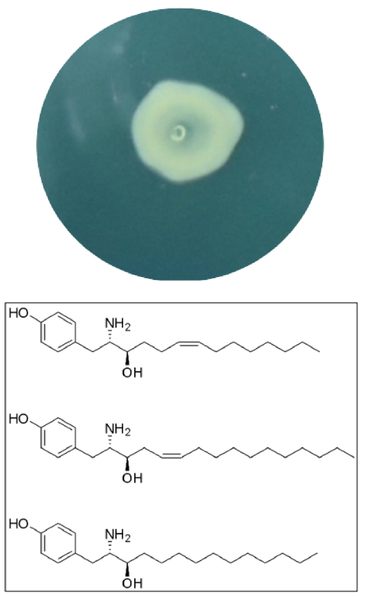 ▲新型抗生素:海洋弧菌菌株(上),利用質譜照影、分子網絡把菌株產生,具有相近質譜片段的化合物連結,找出三種具有活性的 vitroprocine(下)。Vitroprocine 對易產生抗藥性、造成醫療院所院內感染的細菌例如金黃色葡萄球菌、克雷伯氏肺炎菌、白色念珠菌與鮑氏不動桿菌都有抑制效果,有望作為新一代的抗生素藥物。影像來源/廖志中
